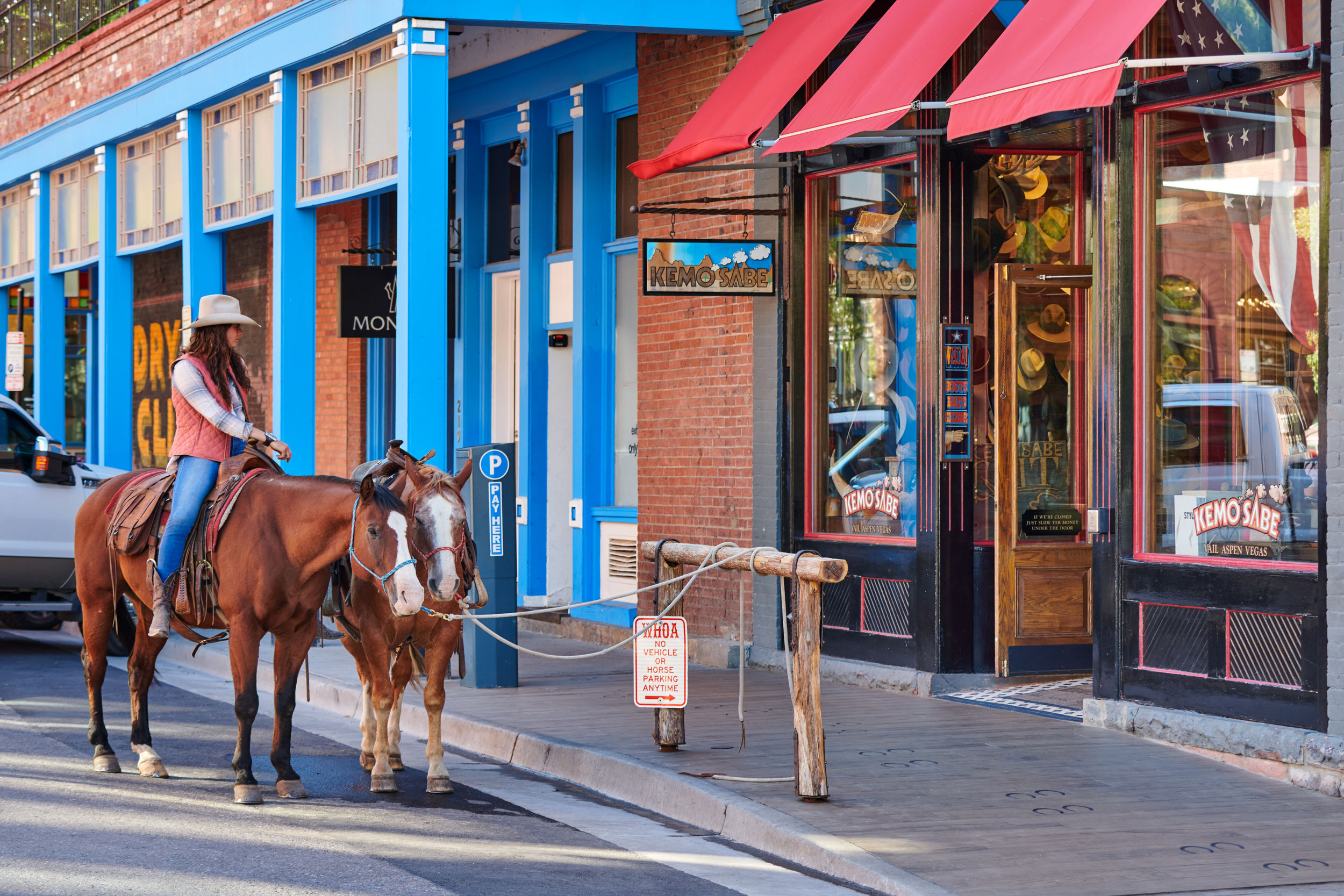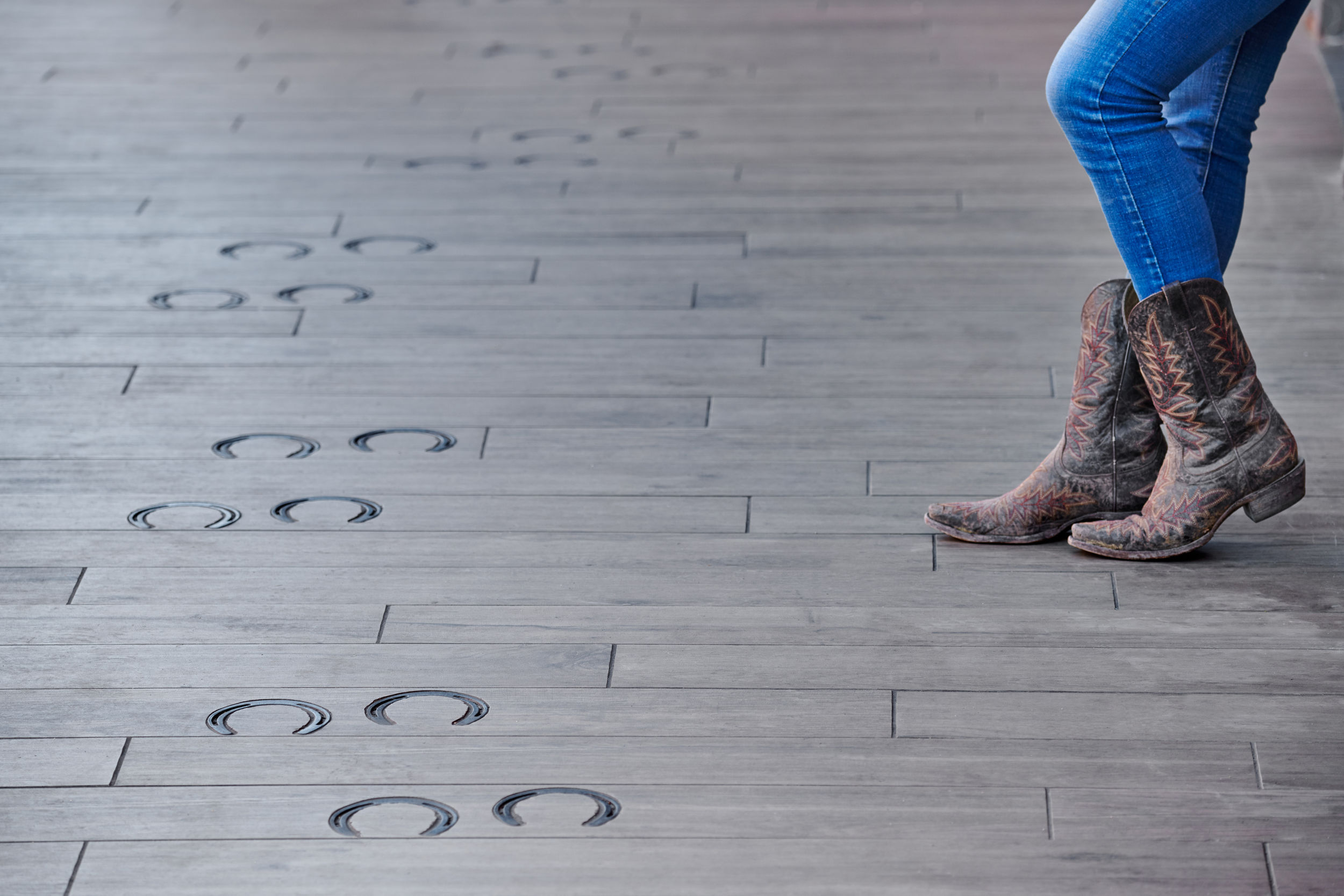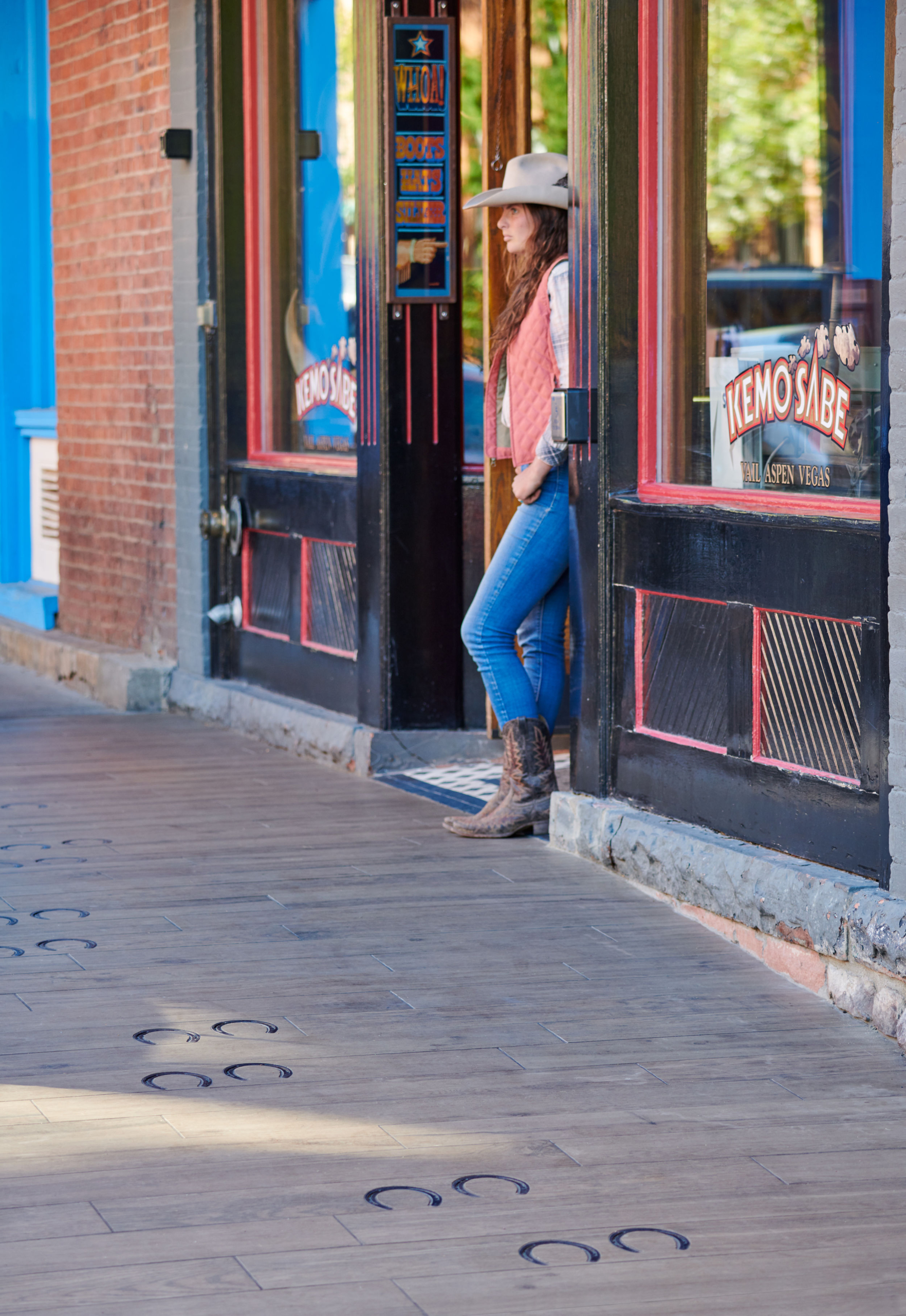Kemo Sabe is a retail store occupying prime real estate in downtown Aspen, Colorado. The shop, specializing in western wear, desired to remodel their exterior space to reflect Aspen’s historic past and give passersby a taste of that period. As originally envisioned, Kemo Sabe would have taken over a parking space and provided a hitching post for horses. Connect One Design worked with the City of Aspen staff, mayor, city chamber and retail boards, and the Commercial and Lodging Commission to seek approvals for this atypical request in the City’s right of way. Ultimately, the parking space idea was set aside in favor of sidewalk improvements. Connect One Design specified a wood-look, all-weather porcelain tile, laid perpendicular to the store entrance, as both a design gesture to Aspen’s historic wooden sidewalks aligned so throughout the city at the turn of the century, and as an invitation to enter. Additionally, in lieu of horses in the street, horseshoes were embedded into the tiles and a decorative hitching post was added, as a final token to Aspen’s past.