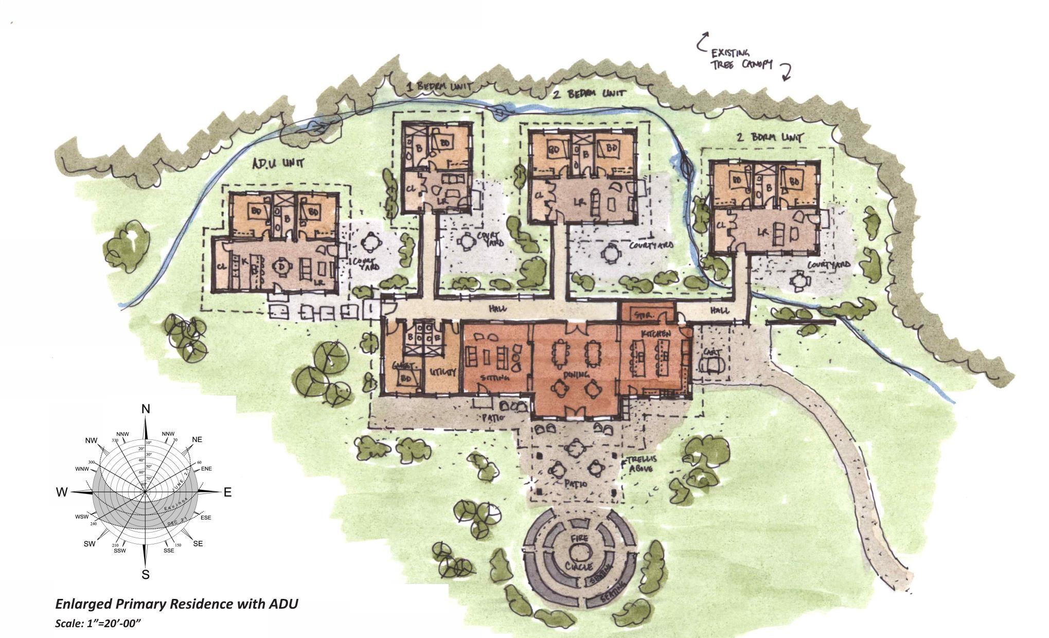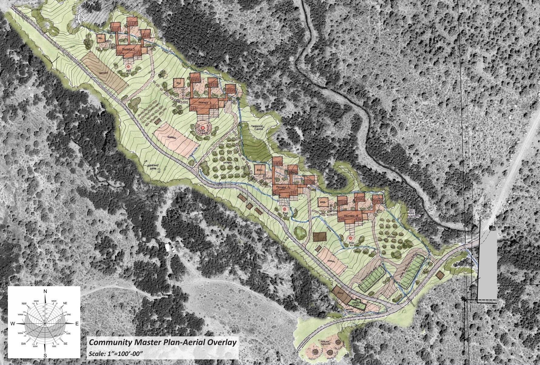 The primary goal for the project is to produce a development for approximately 36 individuals with a minimum environmental footprint. Efforts to increase sustainability within the community include recycling of waste water on-site for agriculture and solar production of 100% of the power needs of the community.