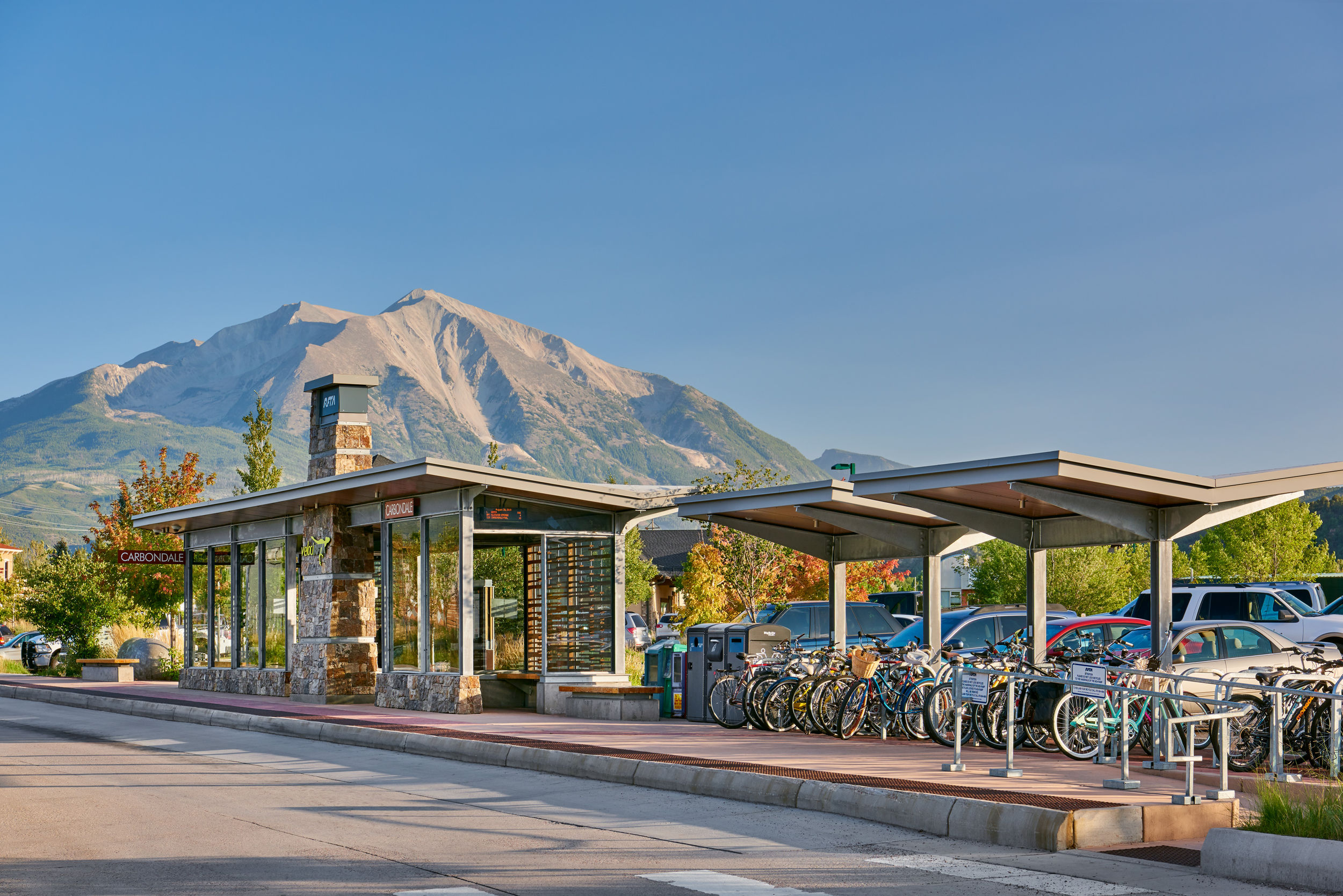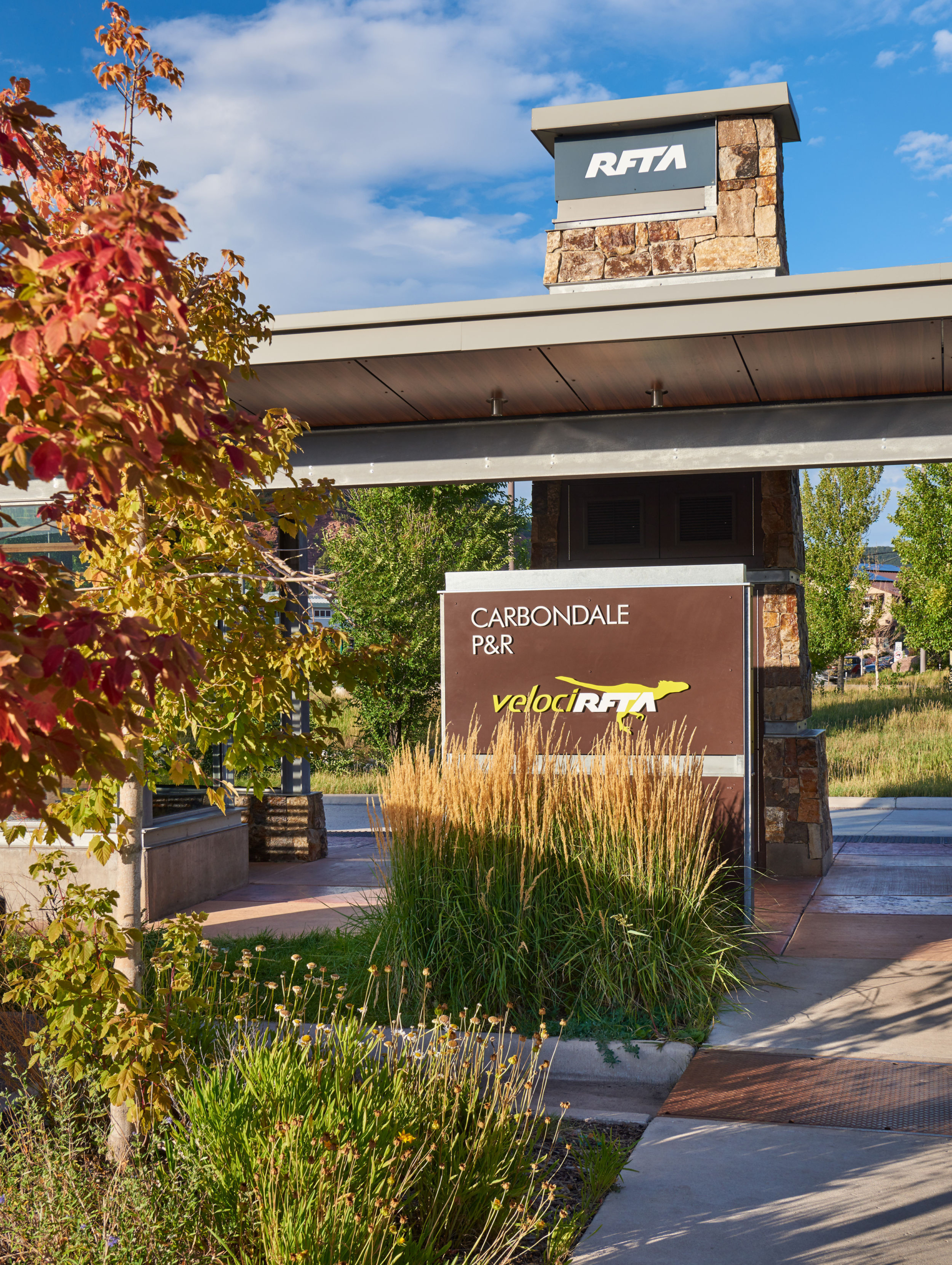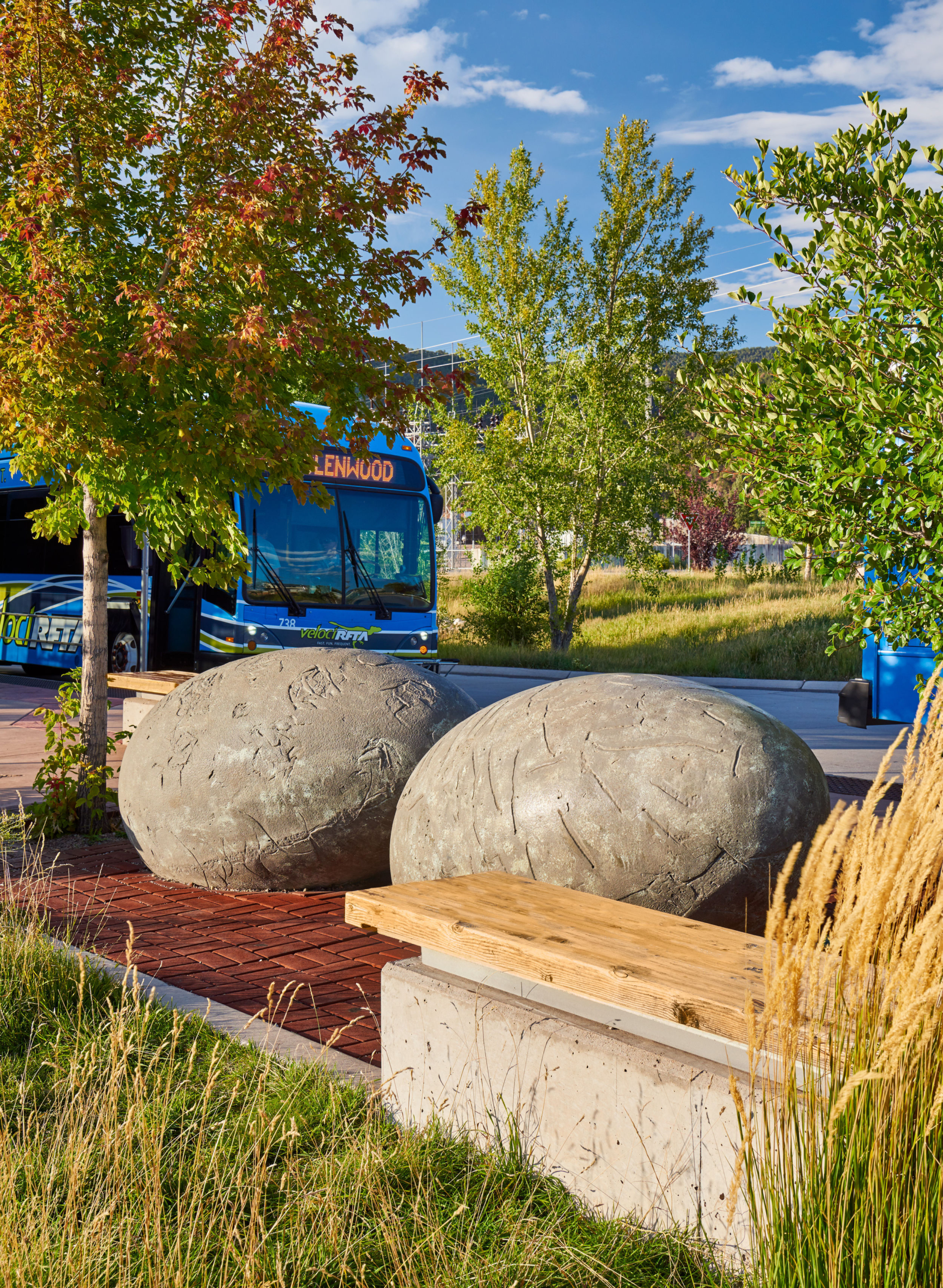 Though the stops are distributed throughout the 40 mile corridor, they are tied together through the concept of geologic strata reflected in the materials incorporated at each stop. The concept of geologic strata not only provides a ‘story’ that ties the valley together but also reinforces the repetition of distinctive hardscape and landscape elements that enhance the station aesthetics and the VelociRFTA brand. This design interpretation ranges from whimsical dinosaur egg seats and footprints to the sophisticated use of banding and color in the shelter and platform. A native and low-water use plant palette celebrates the landscapes seen up and down the Roaring Fork Valley. All the elements of the stations are designed to gracefully withstand heavy use and a restricted maintenance program.