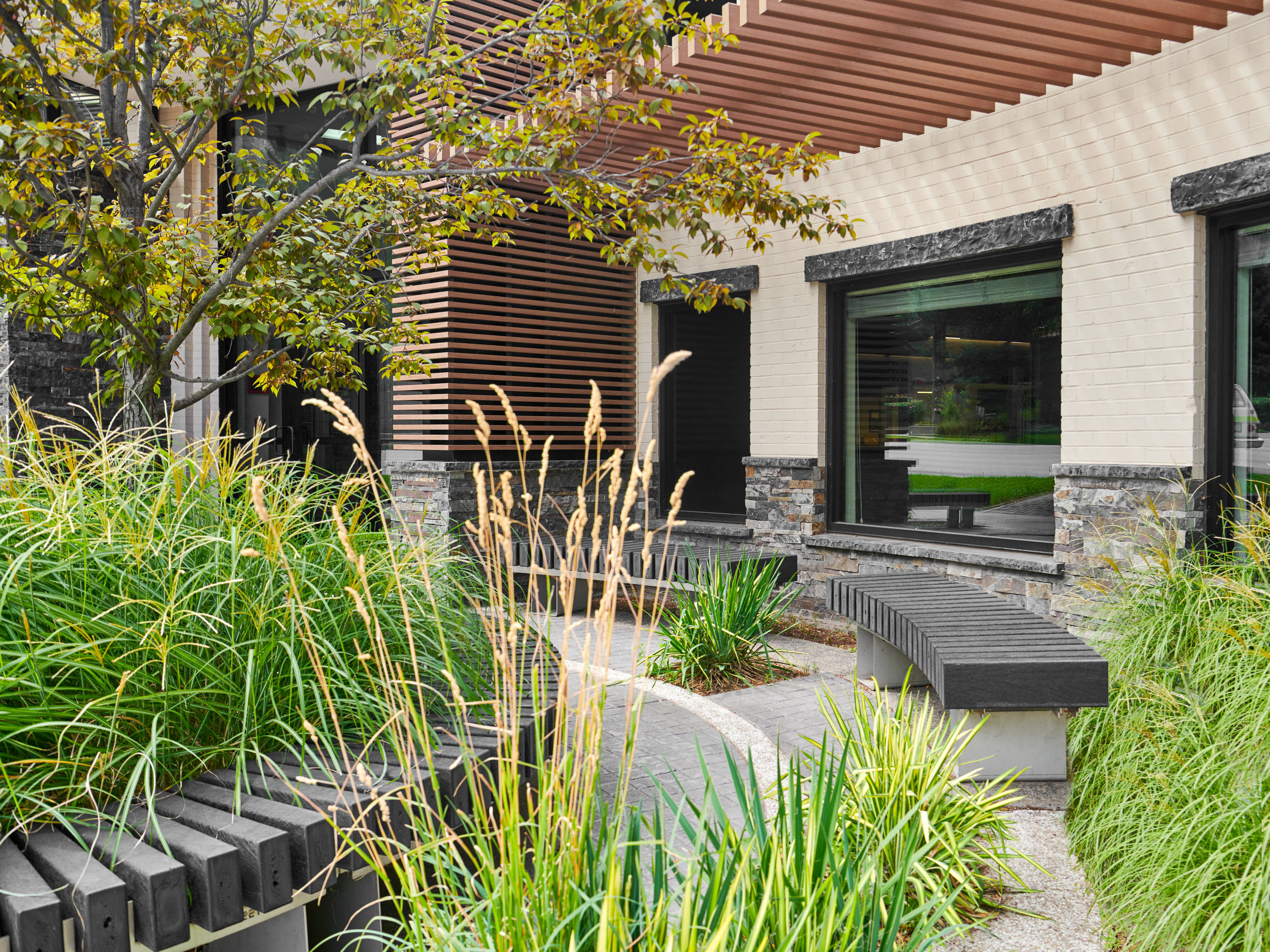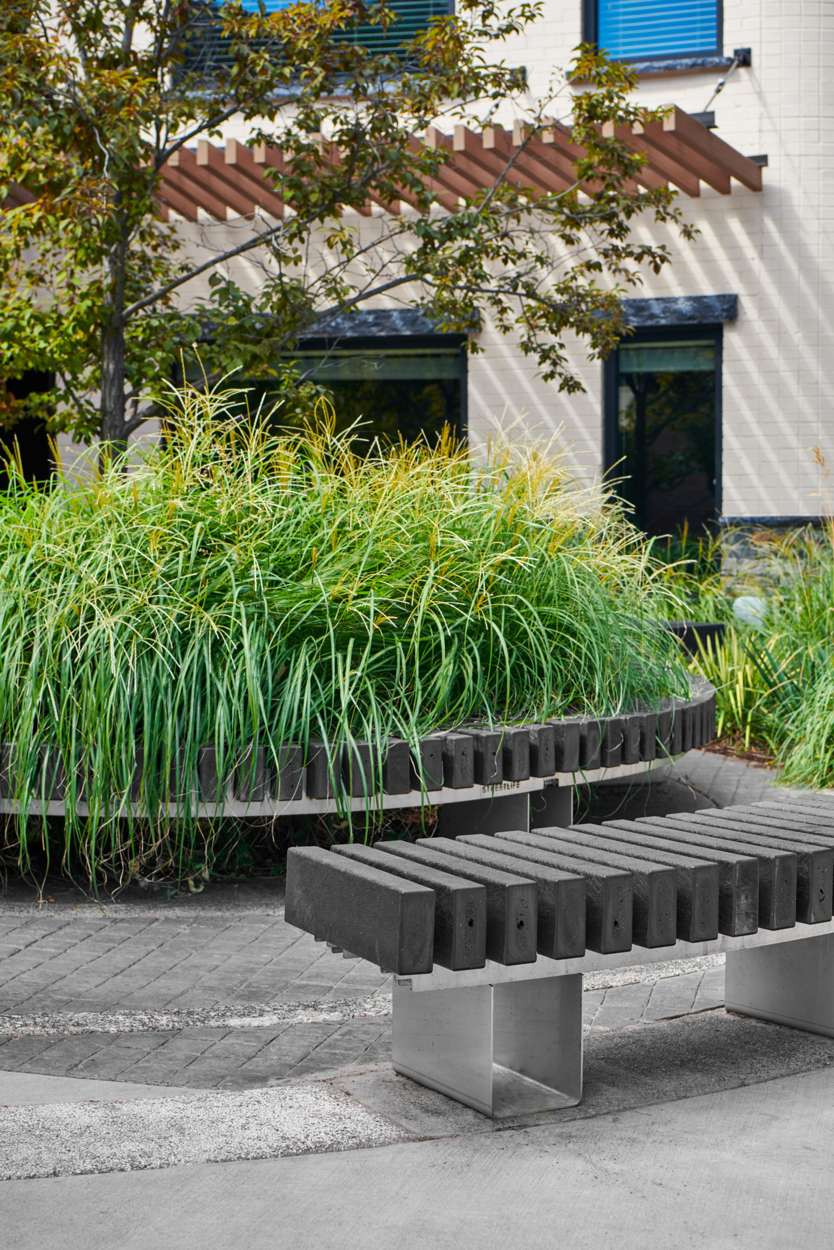 Located in Downtown Glenwood Springs, the Tamarack Building was bought by a developer who envisioned a significant architectural remodel. Working alongside David Johnston Architects, Connect One Design spun a concept that was grounded in the building’s well known curved façade. A specimen shade tree centers the outdoor public space. Offset radiating circular bands, made from materials that reflect and highlight the new building façade, unify and envelop the street sidewalk, creating a much larger perceived gathering space. Circular and curvilinear benches were added to the design as pedestrian guides, as well as heightening the circular concept on the vertical plane. The plants chosen provide alternating height, texture and color in correlation with the hardscape pattern and help express the most prominent architectural features.